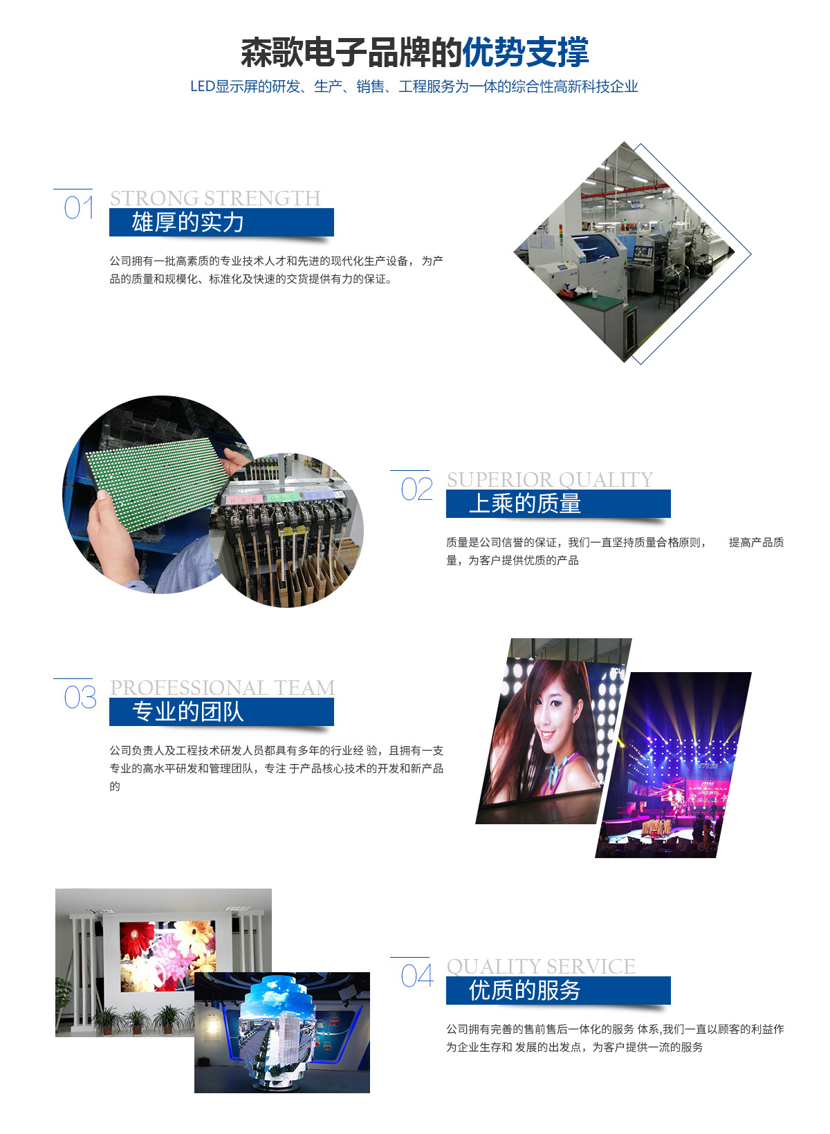鄭州森歌電子科技有限公司是一家專業(yè)從事LED顯示屏的生產(chǎn)、銷售、工程服務為一體的高新科技企業(yè)。公司擁有一批高素質(zhì)的專業(yè)技術(shù)人才和先進的現(xiàn)代化生產(chǎn)設備,公司的主要負責人及工程技術(shù)研發(fā)人員都具有15年以上的LED行業(yè)經(jīng)驗,擁有一支專業(yè)的高水平研發(fā)和管理團隊,專注于LED核心技術(shù)的開發(fā)和LED新產(chǎn)品的自主創(chuàng)新,為產(chǎn)品的質(zhì)量和規(guī)模化、標準化及快速的交貨提供有力的保證。公司在福建、深圳建立了生產(chǎn)基地。 鄭州森歌電子科技堅持以方案完善,質(zhì)量過硬,服務及時為口號,堅持走高品質(zhì)路線。現(xiàn)我公司工程業(yè)績已遍布省內(nèi)外,并且在政府機構(gòu)、軍事指揮、銀行系統(tǒng)、醫(yī)療教育、室內(nèi)外廣告、酒店會所、公安指揮調(diào)度、水利工程、視頻會議等多個行業(yè)領(lǐng)域得到廣泛應用并獲得客戶的一致好評和普遍認可,是客戶值得信賴的長期戰(zhàn)略合作伙伴。